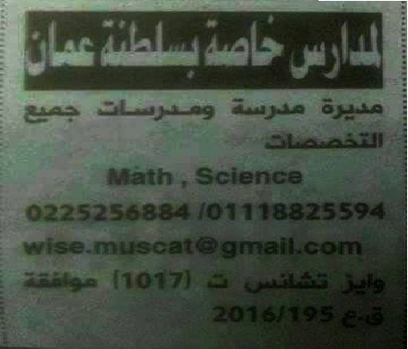 اعلنت احدى المدارس الخاصة بسلطنة عمان عن حاجتها الى "مدرسات لجميع التخصصات" و"مديرة مدرسة" كما اعلنت عن حاجتها الى مدرسين فى التخصصات التالية