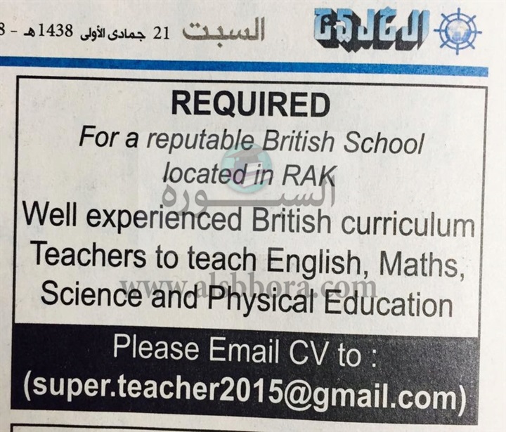 تعلن كبرى المدارس الدولية برأس الخيمة بالامارات العربية المتحدة عن حاجتها الى معلمين ومعلمات، وعلى الراغبين فى التقدم ارسال السيرة الذاتية عبر الايميل المنشور فى الاعلان التالى: