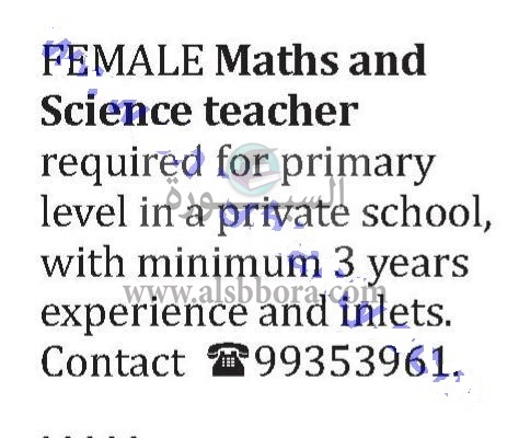تعلن كبرى المدارس بسلطنة عمان عن حاجتها الى معلمين ومعلمات، وعلى الراغبين فى التقدم الاتصال بالارقام المنشورة فى الاعلان التالى: