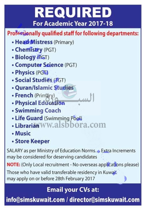 تعلن كبرى المدارس بدولة الكويت عن حاجتها الى معلمين فى 14 مادة دراسية، للعام الدراسى 2018/2017، وعلى الراغبين فى التقدم ارسال السيرة الذاتية عبر الايميل المنشور فى الاعلان التالى: