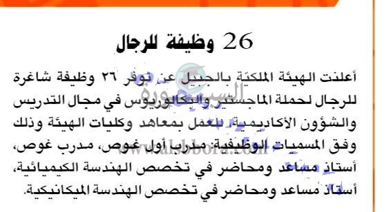 تعلن الهيئة الملكية بالجبيل بالمملكة العربية السعودية عن حاجتها الى أعضاء هيئة تدريس فى 26 تخصص من حملة الماجستير والبكالوريوس، وعلى الراغبية فى التقدم الدخول على موقع الهيئة، اضغط هنااااااااااا