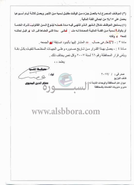 أصدر محافظ المنيا اللواء عصام الدين البديوى ، قرار 88 لسنة 2017 ، لتوضيح قواعد العمل ورصيد الاجازات ، والموقف المالى للعاملين التابعين لجميع الهيئات الحكومية من " التنظيم والادارة - الصحة والسكان - الطب البيطرى -القوى العاملة والهجرة - الطرق والنقل - الزراعه - المحافظة - الوحدات المحلية - الاسكان والمرافق - التموين - التضامن الاجتماعى - التربية والتعليم للموظفين الغير مخاطبين بقانون 155 لسنة 2007 والمطبق عليهم القانون 155 سيطبق عليهم الشق الادارى وليس الشق المالى" .