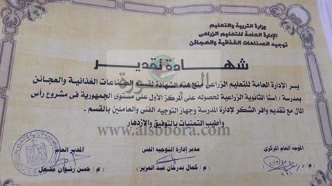 حصل قسم الصناعات الغذائية والعجائن بمدرسة إسنا الثانوية الزراعية التابعة لإدارة اسنا التعليمية بمحافظة الأقصر على المركز الأولى على مستوى لجمهورية بمشروع رأس المال ،ومنحت الوزارة شهادة تقدير للمدرسة وقدمت الشكر لجميع العاملين بالقسم على مجهوداتهم.