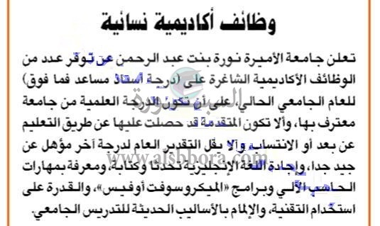 تعلن جامعة الاميرة نورة بنت عبد الرحمن بالمملكة العربية السعودية عن حاجتها للتعاقد مع أعضاء هيئة التدريس جدد وفقا للإعلان التالي: