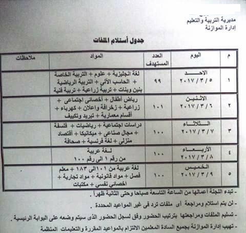 وقد شددت لجنة استلام الملفات انه لن يتم استلام ومراجعة اى ملفات ترد فى غير المواعيد المحدده فى الجدول المرفق ،ويتم تسليم الملفات ومراجعاتها بترتيب الحضور وفق لسجل الحضور الذى سيتم وضعه على البوابه الرئيسة ، وقد جاءت الوظائف للمعلمين فى التخصصات التالية