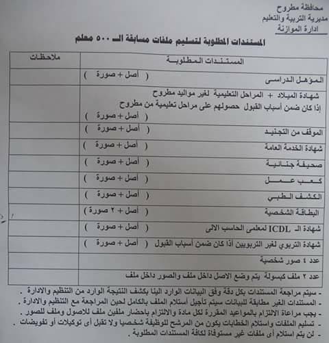 اعلنت " مديرية التربيه والتعليم ادارة الموازنه " محافظة مطروح عن مواعيد استلام ملفات التعيين للمعلمين فى مسابقة تعيين 500 معلم مساعد بمختلف الادارات وفقا للاعلان الرسمى السابق الاعلان عنه ، وقد اعلنت عن جدول استلام الملفات بداية من يوم الاحد 5/3/2017 حتى الخميس 9/3/20177 ، على ان تبدء اللجنه اعمالها من الساعه التاسعه ص وحتى 2 ظهرا .