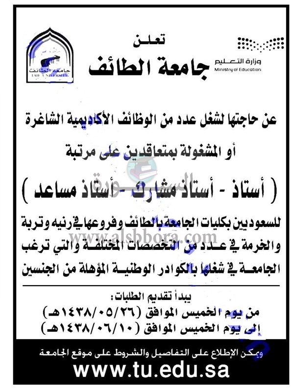 تعلن جامعة الطائف عن حاجتها الى أعضاء هيئة التدريس، وعلى الراغبين فى التقدم الدخول على موقع الجامعة اضغط هناااااااا.