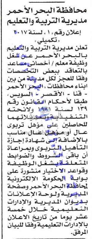 تعلن وزارة التربية والتعليم والتعليم الفنى عن حاجتها الى معلمين ومعلمات، وعلى الراغبين فى التقدم التواصل مع الادارات التعليمية بالمحافظات المنشورة فى الاعلان بجريدة الجمهورية اليوم السبت الموافق 25 فبراير 2017.