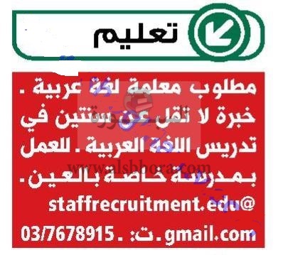 تعلن كبرى المدارس بدولة الامارات العربية المتحدة عن حاجتها الى معلمات، وعلى الراغبين فى التقدم ارسال السيرة الذاتية عبر الايميل المنشور فى الاعلان التالى: