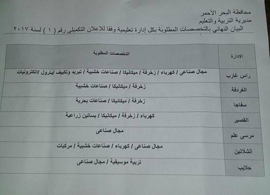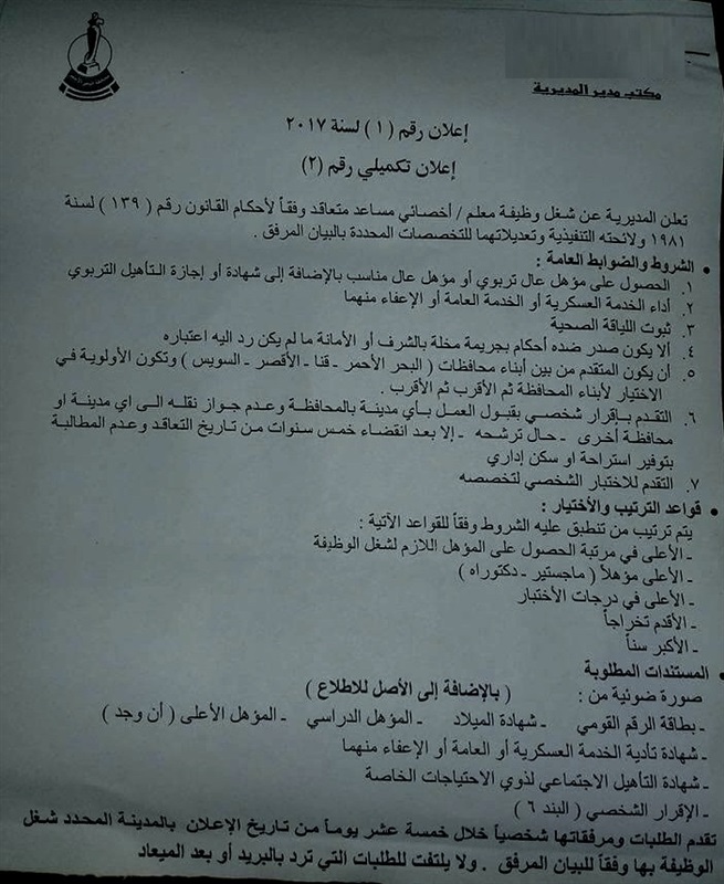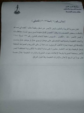 اعلنت مديرية التربية والتعليم بالبحر الأحمر عن شغل وظيفة معلم / أخصائي مساعد بالتعاقد ببعض التخصصات وفقا للعجز لكل مدينة من بين أبناء محافظات ( البحر الأحمر - قنا - الأقصر - السويس ) طبقا لأحكام القانون رقم ١٣٩ لسنة ١٩٨١ ولائحته التنفيذية وتعديلاتهما الحاصلين على مؤهل تربوي عال أو مؤهل عال مناسب بالإضافة إلى شهادة إجازة التأهيل التربوى و بمراعاة أن وفقا للشروط و الضوابط المتعلقة بشغل الوظيفة وقواعد الاختيار فى الاعلان ، على ان يتاح التقديم خلال خمسة عشر يوما من تاريخ الإعلان بالإدارات التعليمية وفقا للبيان المرفق