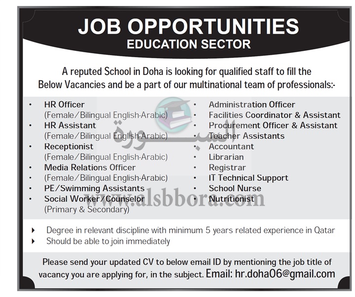 تعلن مدرسة خاصة في دولة قطر عن حاجتها للتعاقد مع معلمين ومعلمات في جميع المواد وذلك وفقا لنص الإعلان التالي:-