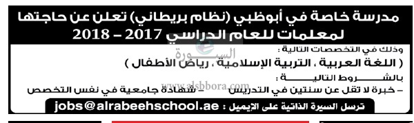 تعلن المدرسة البريطانية في أبوظبي بدولة الامارات تعلن عن وظائف جديدة للمعلمين والمعلمات لعام 2017 / 2018 وفقا لنص الإعلان التالي: