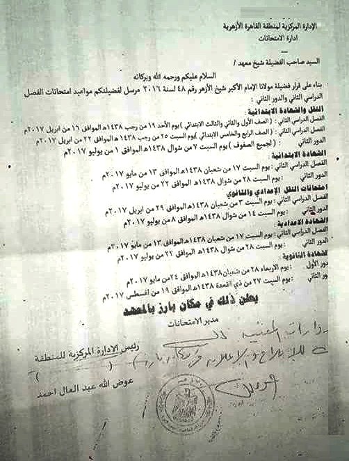 اصدرت الادارة المركزية بالمنطقة الازهرية لمحافظة القاهرة " الازهر الشريف " قرار بمواعيد امتحانات النقل والشهادة الابتدائية للفصل الدراسى الثانى ، والتى جاءت على النحو التالى :