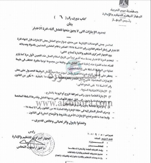بالمستندات| التنظيم والادارة يصدر كتابا دوريا بشأن تحديد الاجازات التى لا يجوز منحها للعامل اثناء فترة الاختبار
