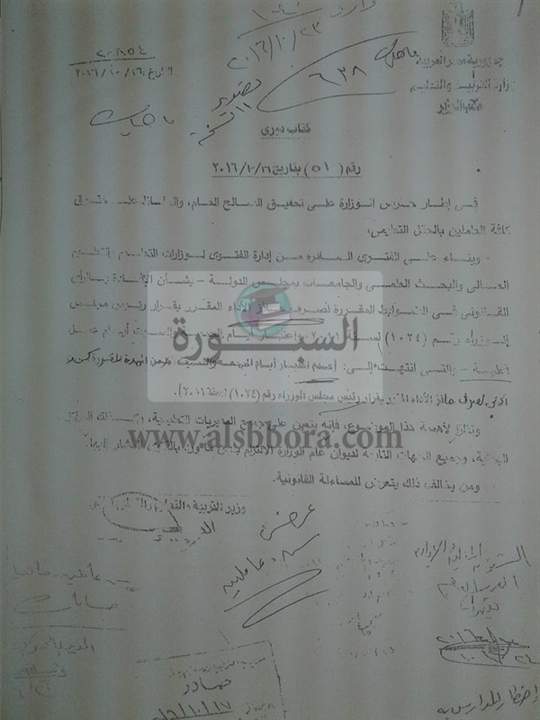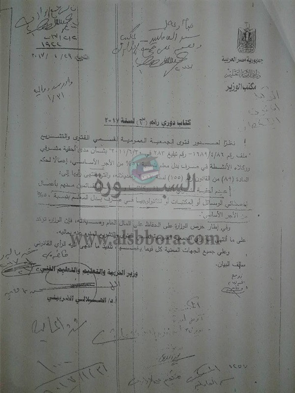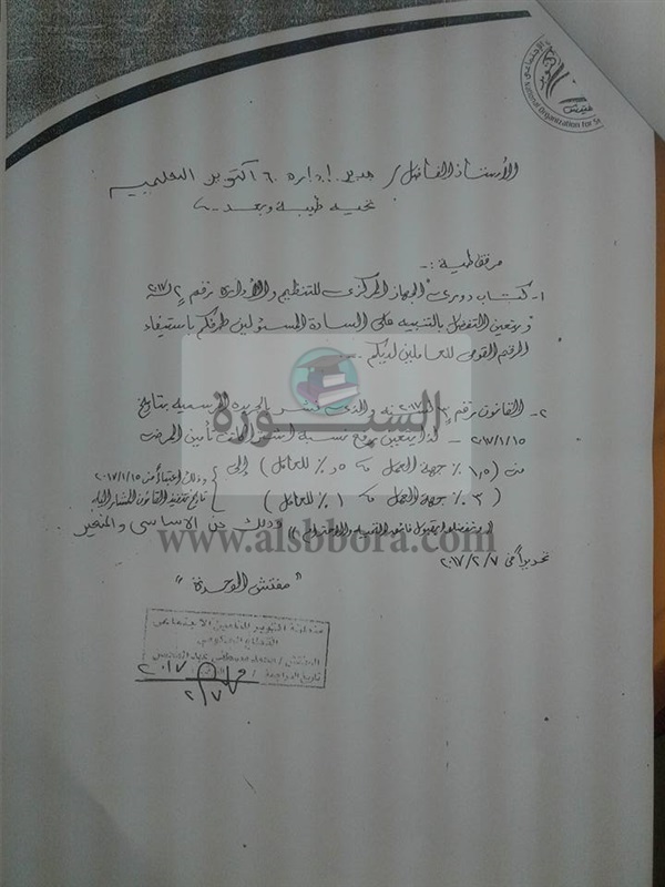 كشفت مصادر من وزارة التربية والتعليم بموقع"السبورة"، انه سوف يتم تطبيق خصم من رواتب المعلمين تبدأ من 200 الى300 جنيه وهذا ما تم هذا الشهر شهر مارس2017 بناء على الفاكس لزياده خصم نسبه التأمين الاجتماعى والمعاشات مع الرجوع لكادر 2015 بدلا من كادر 2016 وهذا أقل بكتير وهذا ما جاء بناء على قانون الأحوال المدنيه الصادر لعام 2015 . وهذا الخصم سيتم ليس فى هذا الشهر فقط بل باستمرار بالاضافه إلى عدم احتساب يومى الجمعه والسبت كايام عمل.