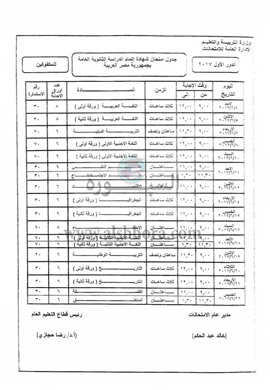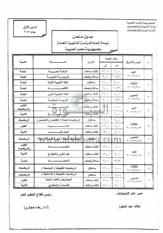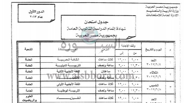 جدير بالذكر أن امتحان الدور الأول لشهادة إتمام الدراسة الثانوية العامة للعام الدراسي الحالي سوف يبدأ بمشيئة الله – تعالى- اعتبارًا من يوم الأحد الموافق 4/6/2017 ويستمر حتى يوم الخميس الموافق 22/6/2017، علمًا بأنه جارٍ رفع الجدول النهائي على الموقع الرسمي للوزارة