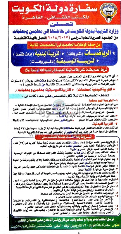تعلن السفارة الكويتية في القاهرة تعلن عن وظائف جديدة للمعلمين والمعلمات المصريين في المواد الورادة في نص الإعلان التالي: