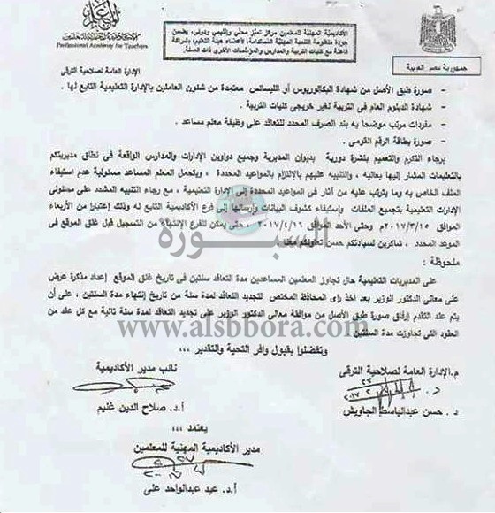 وتطالب الاكاديمية من خلال منشورها بأن على المديريات التعليمية حال تجاوز المعلمين المساعدين مدة التعاقد سنتين إعداد مذكرة عرض على وزير التربية والتعليم بعد أخذ رأي المحافظ المختص بتجديد التعاقد لمدة سنة ثالثة من تاريخ انتهاء مدة السنتان على ان يتم عند التقدم الى الاكاديمية ارفاق صورة طبق الاصل من موافقة وزير التعليم على تجديد لسنة ثالثة مع كل عقد من العقود التي تجاوزت سنتان في التعاقد .