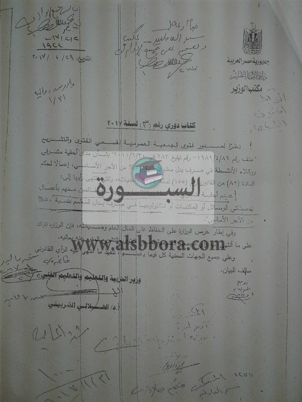 كشفت مصادر من وزارة التربية والتعليم بموقع"السبورة"، انه سوف يتم تطبيق خصم من رواتب المعلمين تبدأ من 200 الى300 جنيه وهذا ما تم هذا الشهر شهر مارس2017 بناء على الفاكس لزياده خصم نسبه التأمين الاجتماعى والمعاشات مع الرجوع لكادر 2015 بدلا من كادر 2016 وهذا أقل بكتير وهذا ما جاء بناء على قانون الأحوال المدنيه الصادر لعام 2015 . وهذا الخصم سيتم ليس فى هذا الشهر فقط بل باستمرار بالاضافه إلى عدم احتساب يومى الجمعه والسبت كايام عمل.