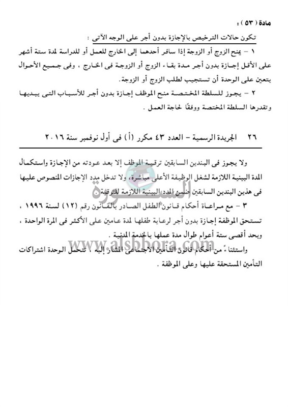 ينشر موقع "السبورة" الاجازة الوجوبية بحكم نص القانون ولا تمنع ترقية الموظف طبقا لصريح نص المادة رقم 53 من القانون رقم 81 لسنة 2016م ولكن بالنسبة للقانون رقم 155 لسنة 2007م وتعديلاته تمنع لانها عن سنوات عمل فعلية وتقريرين تقويم اداء فعلي بمرتبة فوق المتوسط علي الأقل عن سنتين سابقتين مباشرة علي النظر في الترقية مما يهدر مبدا المساواة وتكافؤ الفرص الذي نص عليه الدستور المصري وشبهة عدم دستورية المادة رقم 80 من القانون رقم 93 لسنة 2012م ولذلك يتم اللجؤ للقضاء للترقية.