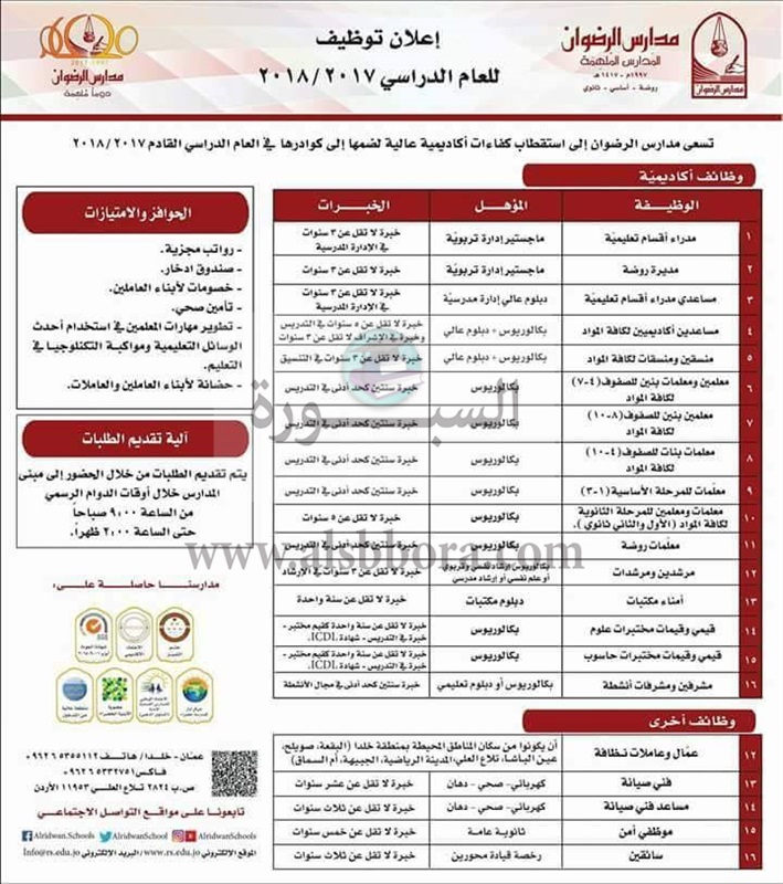 تعلن مدارس الرضوان عن وظائف جديدة للمعلمين والمعلمات والإداريين في جميع المواد وفقا لنص الإعلان التالي:-