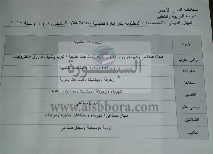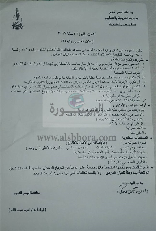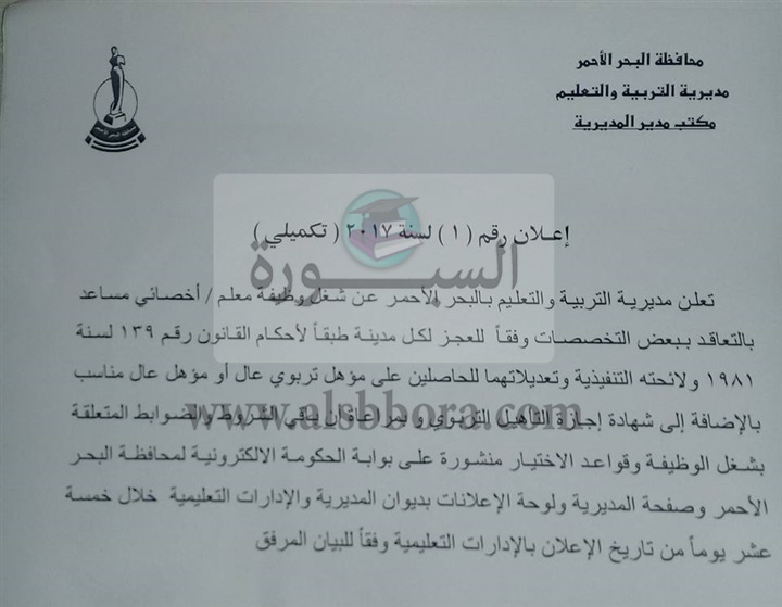 تعلن مديرية التربية والتعليم بمحافظة البحر الأحمر عن حاجتها الى معلمين مساعدين واخصائيين للتعيين من جميع المحافظات، وعلى الراغبين فى التقدم الدخول على بوابة الحكومة الالكترونية لمحافظة البحر الاحمر وصفحة المديرية ولوحة الاعلانات بديوان المديرية والادارات التعليمية.