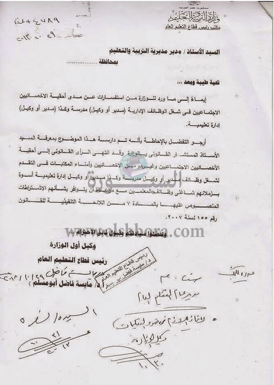 ارسلت وزارة التربية والتعليم فاكسا الى المديريات التعليمية بأحقية الاخصائيين الاجتماعيين فى شغل الوظائف الادارية "وكيل ومدير مدرسة" أسوة بزملائهم شاغلى وظائف المعلمين مع مراعان أن يتوافر بشأنهم الاتراطات المنصوص عليها بالمادة 7 من اللائحة التنفيذية للقانون رقم 155 لسنة 2007.