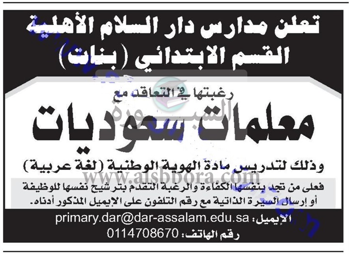تعلن مدارس دار السلام الأهلية بالمملكة العربية السعودية عن حاجتها الى معلمات، وعلى الراغبين فى التقدم ارسال السيرة الذاتية عبر الايميل المنشور فى الاعلان التالى: