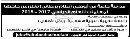 تعلن مدرسة خاصة في إمارة أبوظبي بدولة الإمارات عن حاجتها للتعاقد مع معلمين ومعلمات وذلك في المواد الواردة في نص الإعلان التالي:-