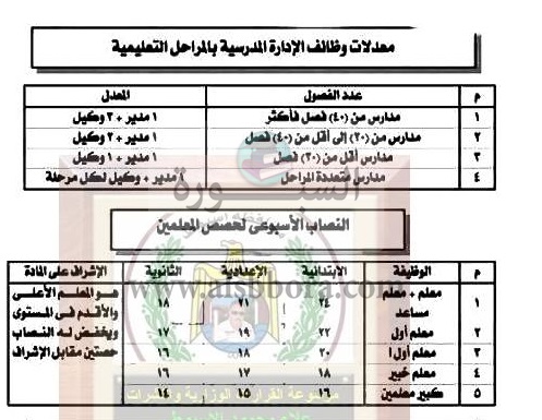 تنشر "السبورة" معدلات وظائف الإدارة المدرسية بالمراحل التعليمية المختلفة والنصاب الأسبوعي لحصص المعلمين.