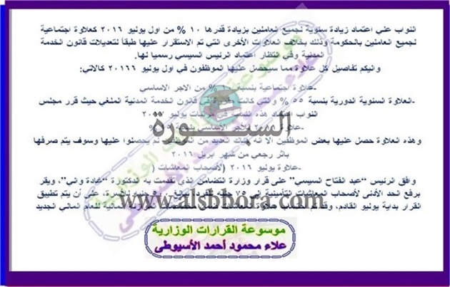 بالمستندات | تعرف علي علاوة "يوليو2017" التي سيحصل عليها الموظفين وأصحاب المعاشات