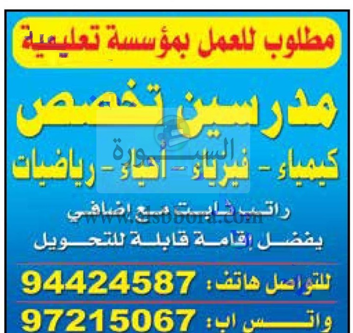 تعلن مؤسسة تعليمية في دولة الكويت عن حاجتها للتعاقد مع معلمين جدد وذلك في التخصصات التالية: