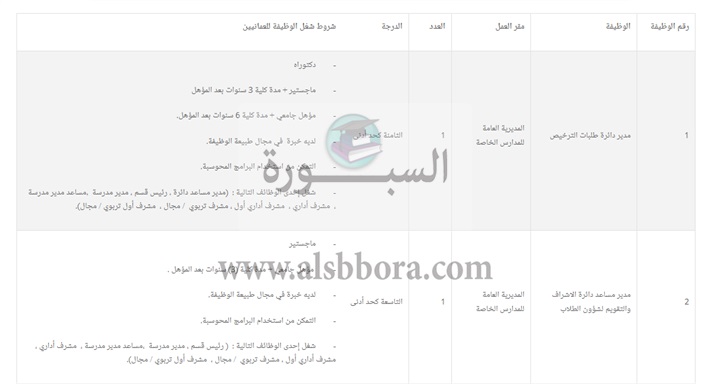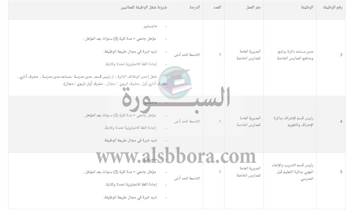 تعلن وزارة التربية والتعليم بسلطنة عمان عن وجود وظائف شاغرة, فعلى من يجد في نفسه الكفاءة والرغبة لشغلها من موظفي الديريات العامة بديوان عام الوزارة والمديريات التعليمية بالمحافظات أن يتقدم بطلب شغلها لمكتب المدير العام بالمديرية العامة للشؤون الإدارية بمبنى ديوان عام الوزارة خلال خمسة عشر يوما عمل من تاريخ نشر هذا الإعلان في البوابة التعليمية ، على أن يكون المتقدم مستوفياً للشروط الآتية :