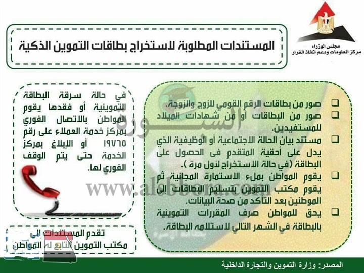 وأضاف البيان أنه يحق للمواطن استلام المقررات التموينية في الشهر التالي لاستلامه البطاقة، كما وجه مركز المعلومات المواطنين بأنهم عليهم الاتصال برقم 19765، حال فقدان البطاقة أو سرقتها.
