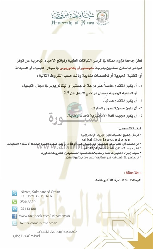 تعلن جامعة نزوي في سلطنة عمان عن وظائف جديدة لأعضاء هيئة التدريس وذلك وفقا لنص الإعلان التالي: