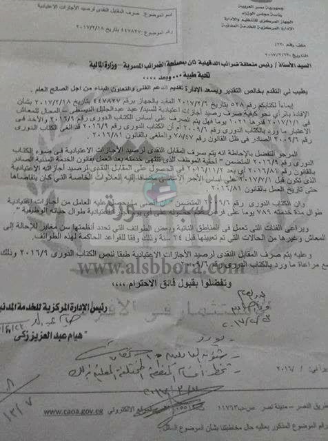 تنشر "السبورة" كتاب الجهاز المركزي للتنظيم والادارة - الادارة المركزية للخدمة المدنية - إلي رئيس منطقة ضرائب الدقهلية ثان بمصلحة الضرائب المصرية بشأن صرف المقابل النقدي لرصيد الاجازات الاعتيادية في ضوء الكتاب الدوري رقم 9 لسنة 2016م .