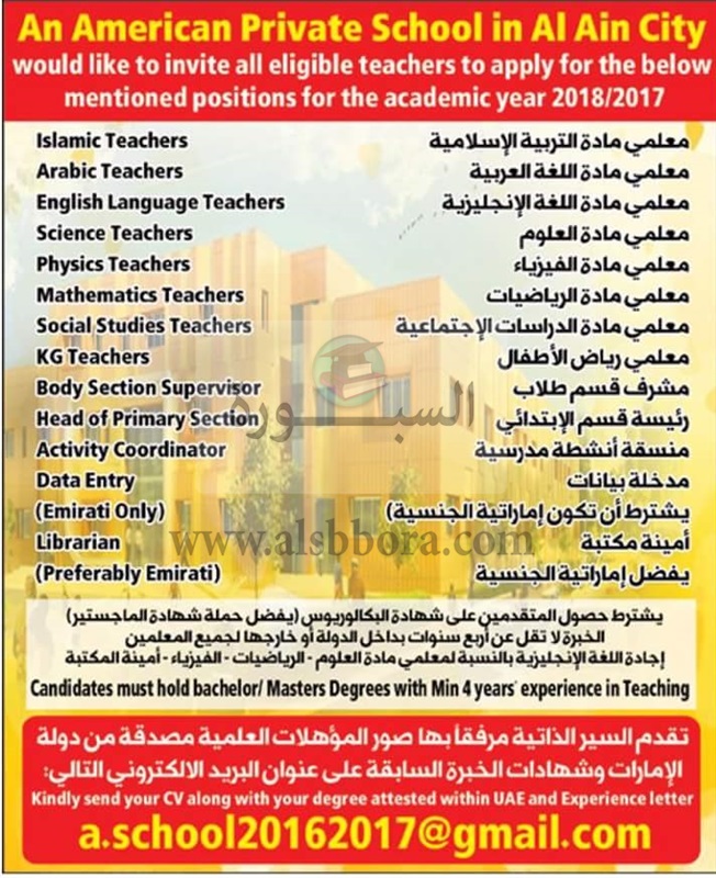تعلن مدرسة خاصة في دولة الإمارات عن حاجتها للتعاقد مع معلمين وذلك المواد الواردة في الإعلان التالي:-