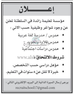 يعلن مركز تعليمي في سلطنة عمان عن حاجتها للتعاقد مع معلمين وذلك المواد الواردة في الإعلان التالي:-