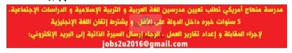 تعلن كبرى المدارس بدولة الامارات العربية المتحدة والتى تتبع المنهاج الامريكى عن حاجتها الى مدرسين، وعلى الراغبين فى التقدم ارسال السيرة الذاتية عبر الايميل المنشور فى الاعلان التالى: