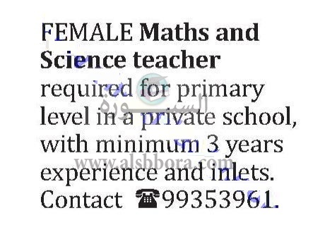 تعلن مدرسة خاص في سلطنة عمان عن حاجتها للتعاقد مع معلمين وذلك في المواد الواردة في نص الإعلان التالي: