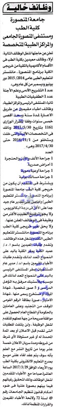 تعلن جامعة المنصورة عن حاجتها الى أعضاء هيئة التدريس، وعلى الراغبين فى التقدم تقديم الطلبات باسم عميد الكلية فى موعد اقصاه 15 يوما من تاريخ نشر الاعلان فى جريدة الأهرام بتاريخ اليوم الاثنين الموافق 13 مارس 2017.