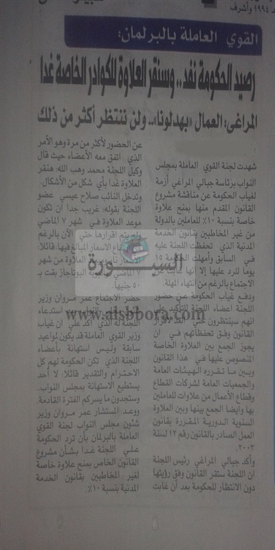 أكد جبالي المراغي رئيس لجنة القوى العاملة بمجلس النواب ان اللجنة ستقر قانون اقرار العلاوة لغير الخاضعين لقانون الخدمة المدنية وفق رؤيتها دون الانتظار للحكومة بعد أن غابت عن الحضور لأكثر من مرة وهو الأمر الذي اتفق معه الأعضاء حيث قال وكيل اللجنة محمد وهب الله: هنقر العلاوة غدا بأي شكل من الأشكال.