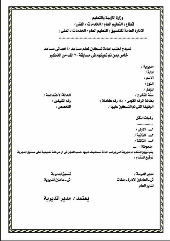 قامت وزارة التربية والتعليم والتعليم الفني ،بارسال فاكس إلى جميع المديريات التعليمية على مستوى محافظات جمهورية مصر العربية، بشأن المعلمين والأخصائيين المساعدين والمعينون ضمن مسابقة الـ 30 ألف معلم، وطالبت الوزارة بملء استمارة البيانات للمعلمين الراغبين فى عودتهم إلى المحافظات الخاصة بهم.