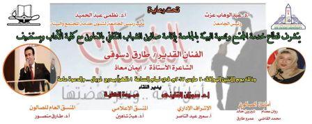 يستضيف صالون الشباب الثقافى بجامعة عين شمس الفنان القدير طارق دسوقى والشاعرة إيمان معاذ ، تحت رعاية أ.د. عبد الوهاب عزت رئيس جامعة عين شمس ، و رئاسة أ.د. نظمى عبد الحميد نائب رئيس الجامعة لشئون خدمة المجتمع و تنمية البيئة وبالتعاون مع كلية الآداب برئاسة أ.د. سوزان القلينى و إشراف أ. سمير عبد الناصر أمين عام الجامعة المساعد لشئون القطاع ، وذلك في تمام الواحدة من ظهر الأثنين 20 مارس الجاري في مدرج غربال بكلية الأداب ، صرح بذلك أ.د.طارق منصور وكيل كلية الأداب لشئون خدمة المجتمع و تنمية البيئة و المنسق العام للصالون .