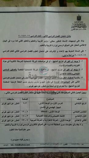 وجاء فاكس مدير عام مادة العلوم بوزارة التربية والتعليم والذى أوضح أنه لايوجد تغيير فى توزيع المنهج أو فى مواصفات الورقة الامتحانية للمرحلة الثانوية.