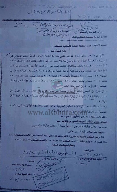 اصدرت وزارة التربية والتعليم فاكس صادر من رئيس قطاع التعليم العام إلى مديري مديريات التربية والتعليم بالمحافظات بشأن شروط شغل وظائف التوجيه الفني.