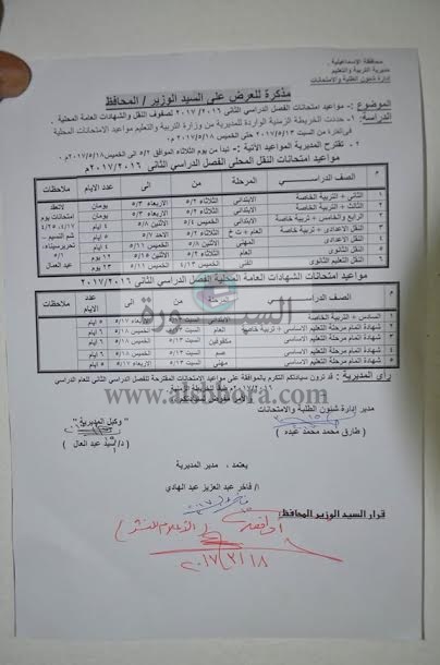 اعتمد اللواء يس طاهر، محافظ الاسماعيلية، اليوم السبت، جداول مواعيد انعقاد امتحانات الفصل الدراسى الثانى ونهاية العام الدراسى 2016/2017 لهذا العام لصفوف النقل والشهادات العامة المحلية والمقرر لها أن تبدأ اعتبارا من يوم الثلاثاء الموافق 2 من شهر مايو، وحتى الخميس الموافق 18 من مايو القادم.