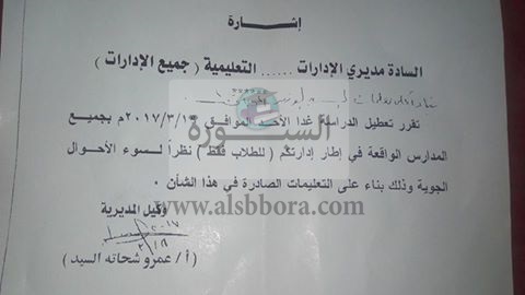 الجدير بالذكر أن وزارة التربية والتعليم كانت قد أعلنت أن المحافظين هم من بيدهم القرار فى توقف الدراسة من عدمها كل فى محافظته وحسب الأحوال الجوية خوفا على حياة الطلاب والتلاميذ.