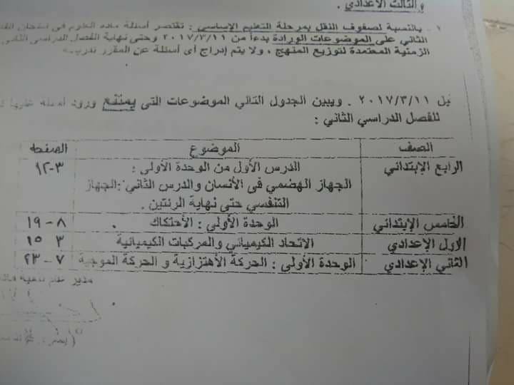 على ان ترد الاجزاء والموضوعات بعد تلك الدروس المحذوفة خلال امتحانات اخر العام الدارسى وفقا للتعليمات الصادرة من مكاتب مستشارين المواد ، والتى تم ارسالها للمديريات والادارات التعليمية بانحاء الجمهورية