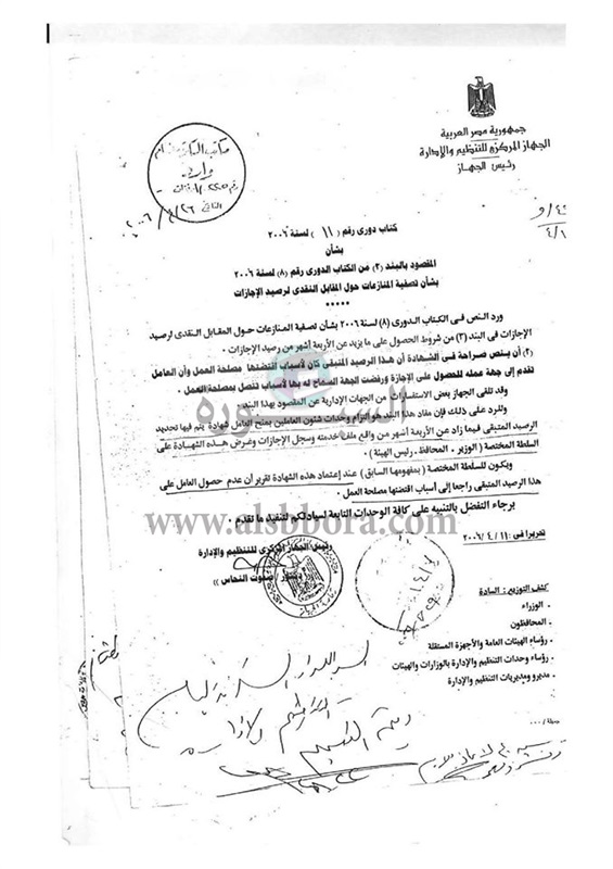 وشرح الجهاز ما المقصود بالكتاب الدوري رقم 11 لسنة 2006م بشأن المقصود بالنبد رقم ( 3 ) من الكتاب الدوري رقم 8 لسنة 2006م بشأن تصفية المنازعات حول المقابل النقدي لرصيد الاجازات.